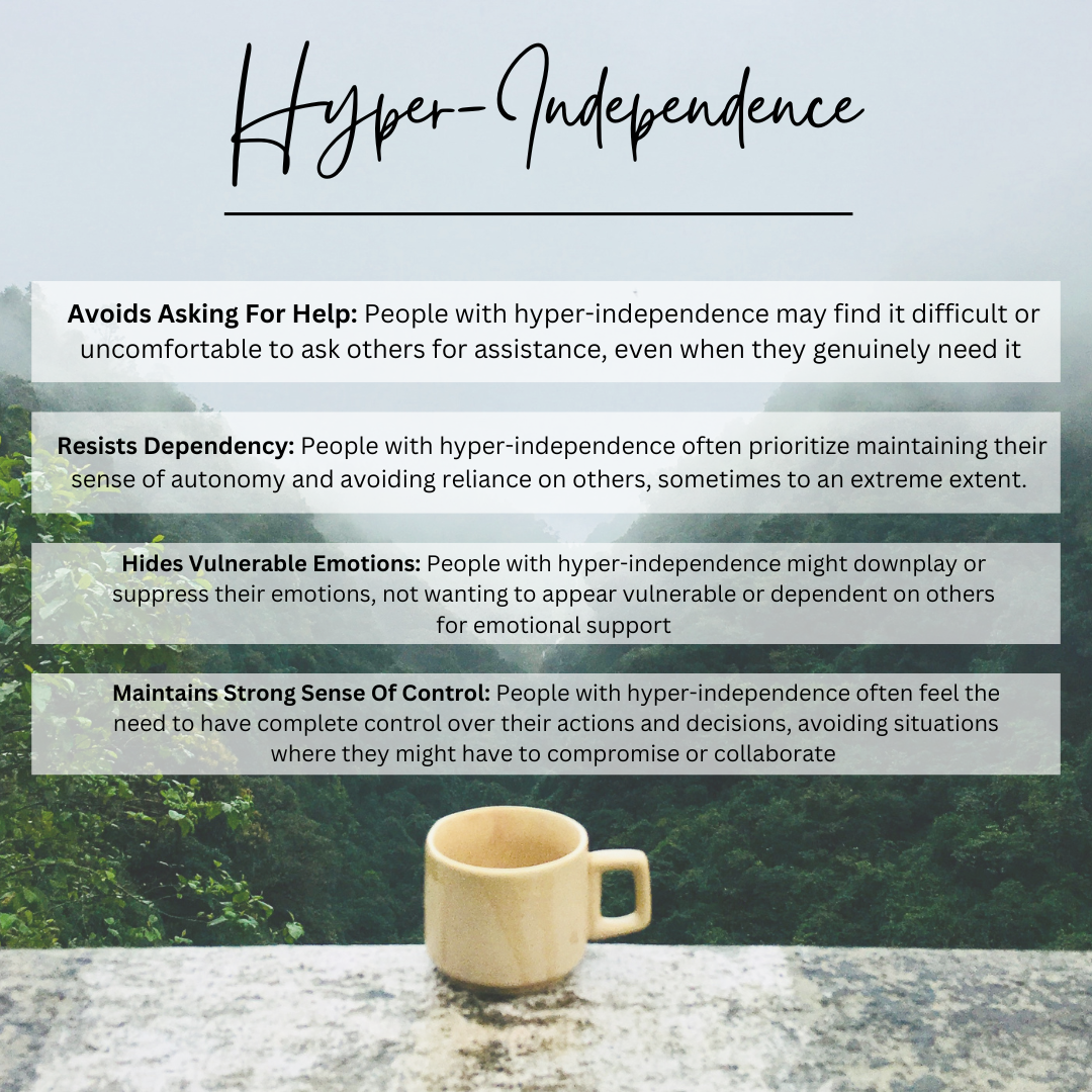 Being hyper-independent is a personality trait characterized by an intense desire for autonomy, self-reliance, and control over one's life. Individuals who exhibit hyper-independent tendencies often have a deep-seated fear of dependence on others and go to great lengths to avoid perceived vulnerability or the need for support.
